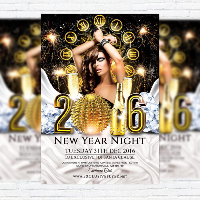 The 2016 New Year Night is the exclusive Photoshop PSD flyer template designed by ExclusiveFlyer to promote your New Year Party. This is a modern, stylish flyer and just be used for a Winter Party Night or Christmas Party or New Year Party etc. Dear customers! – you can also: Customize any flyers or Hire Us to create any unique product. Also, you can get unlimited access to all our templates. You can buy 1 month membership, 3 or 6 months membership or even 1 year membership plan and login on site, choose a design, click the button DOWNLOAD TEMPLATE and it’s yours. No hassle, no checkout! When you paid the template, you can find it in your personal account and of course you’ve got a message to your e-mail (maybe in spam) with link to download. Also, you can find all templates, which you buy, in your personal account! All of our flyers have a very good quality (300DPI). And it means that you just need to download one of them and make the necessary modifications such as replace the elements or choose the colors and start to invite your guests! You can order from us design of Banner Ad, Bi-Fold Brochure, Tri-Fold Brochure, Business Card, Logo, One-Sided Flyer, Two-sided Flyer or Postcard. All you need is to checkout and write us all information on our e-mail or skype. (order now). There are a lot of free flyer templates, free business card templates on our site! Also there are a lot of categories of flyers such as club flyers, seasonal flyers, sport flyers and also business flyers. You have a great choise on our site, so good luck! Don’t forget to follow our Facebook community, our page on Twitter, on Pinterest and on Tumblr and leave comments, cause we work for you! PSD is set up in 1275×1875 dimension (4” x 6” with 0,25” bleed). The PSD file is very well organised, with color coded groups and layers named appropriately. Remember, all stock images of models and other people used only for demonstration all charms of the flyer and don’t included in the download!