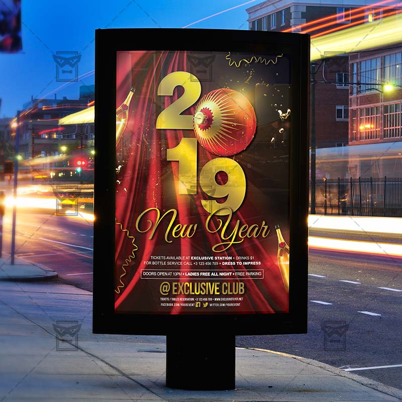 2019 New Year Night is an exclusive PSD flyer template for Adobe Photoshop designed by our best graphic designers to facilitate your task in promoting your business. With our readymade New Year flyer in psd format you can invite you customers and guest to your event or to the best New Year Party, New Year Eve Night, NYE Night or NYE Party in their lives.