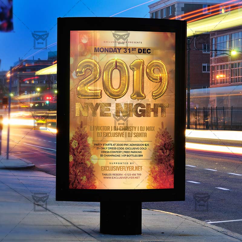 2019 NYE Night is an exclusive PSD flyer template for Adobe Photoshop designed by our best graphic designers to facilitate your task in promoting your business. With our readymade New Year flyer in psd format you can invite you customers and guest to your event or to the best New Year Party, New Year Eve Night, NYE Night or NYE Party in their lives.