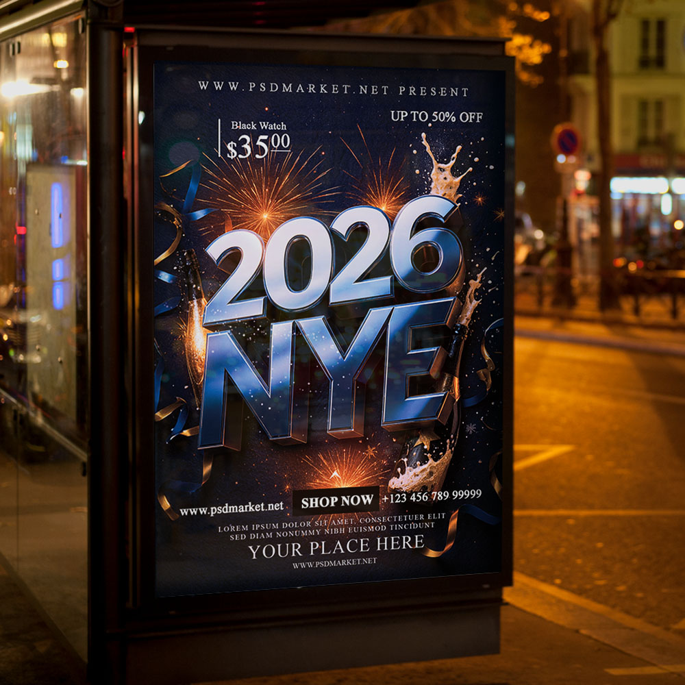 2026 NYE Flyer PSD TemplateCelebrate the arrival of the new year with a stunning announcement! Our versatile and sophisticated **2026 NYE Flyer PSD Template** is the essential design tool for promoting any New Year’s Eve event focused on welcoming the year 2026—from a chic gala dinner and a glamorous cocktail party to a high-energy bar countdown or a grand community celebration. This professional PSD template offers full customizability to ensure your event looks as exciting, exclusive, and unforgettable as the moment the clock strikes midnight. If you’re looking to create an irresistible invitation that screams “**The Official 2026 New Year’s Eve Celebration**,” “**Countdown to Glory**,” and “**Celebrate the Future Now**,” this flyer template is engineered to draw a huge, enthusiastic crowd ready to celebrate the transition. Expect to see striking visuals, often incorporating classic NYE elements like sparkling fireworks, exploding confetti, shimmering metallic effects, elegant or high-energy typography prominently featuring ‘2026’, and a glamorous, festive color scheme (typically featuring gold, silver, deep black, and vibrant red or blue accents) that perfectly captures the sophisticated and thrilling spirit of a major **2026 NYE Event**. This template is all about setting a luxurious, high-spirited, and memorable mood, making your event the absolute place to be on December 31st. The **2026 NYE Flyer PSD Template** offers a highly adaptable and professional layout (as a PSD file), ensuring you can clearly communicate all the essential details of your grand celebration while perfectly maintaining its festive atmosphere. You can easily customize the text fields to include the specific date and time of your event (December 31st), the venue location, any special entry requirements (e.g., ticket purchase details, VIP access, dress code), and information about featured entertainment (e.g., a **live band**, a special guest DJ, a midnight spectacle), details on the **complimentary champagne toast**, **exclusive table reservations**, or information about a special door prize, all presented in a clear and appealing way. Add an enticing description of what attendees can expect, perhaps highlighting opportunities for a special **”Gold Carpet” photo op**, a dedicated dance area, or simply enjoying the holiday with friends as the new year begins. And of course, include clear contact information or prominent social media handles for further engagement and ticket sales. Being a PSD template, it offers exciting options to incorporate additional dynamic graphics like light flares, subtle patterns, or elegant metallic textures, or to adjust the impactful color palette to perfectly match your brand’s aesthetic or the event’s specific vibe. This lets you create a truly unique and memorable promotional piece that looks as luxurious and exciting as your New Year’s Eve celebration feels. Engineered for maximum reach, the **2026 NYE Flyer PSD Template** is designed to be both print-ready for stunning physical distribution and seamlessly optimized for digital sharing. This ensures your exciting invitation reaches a wide and enthusiastic audience. Create eye-catching physical flyers to distribute at high-traffic areas, and effortlessly share the flyer digitally through various social media channels with engaging captions that highlight the glamour, email announcements that build anticipation, and online event listings that attract revelers and guests. This dual functionality helps to maximize visibility and create significant buzz around your 2026 NYE Event. By utilizing this distinctive and attention-grabbing flyer template, you’re not just announcing a party; you’re creating an invitation that broadcasts pure, thrilling celebration and promises an experience filled with great music, high energy, and unforgettable memories, making your “**2026 NYE Event**” the essential destination to welcome the new year. Grab this template today and secure your spot as the top event of 2026! — Features of the 2026 NYE Flyer PSD Template