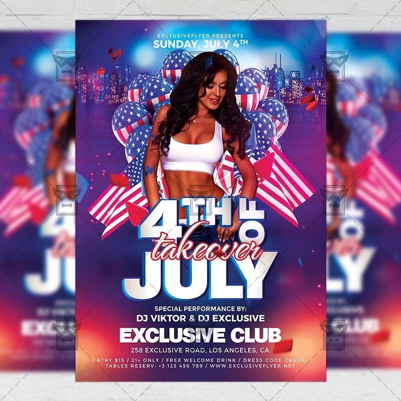 4th of July Takeover an exclusive PSD flyer template for Adobe Photoshop designed by our best graphic designers to facilitate your task in promoting your business. With our readymade 4th of July flyer in psd format you can invite you customers and guest to your event or to the best 4th of July Rooftop Party, USA Independence Day Takeover, USA 4th of July Night, Independence Day Barbeque or 4th of July BBQ in their lives.