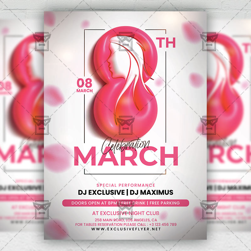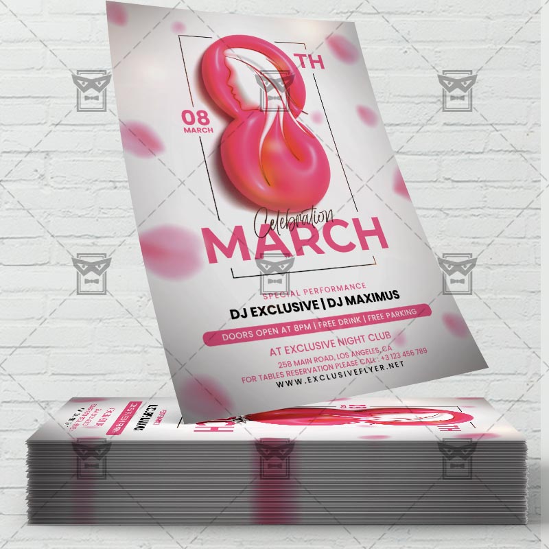 8 March Celebration Template an exclusive PSD flyer template for Adobe Photoshop designed by our best graphic designers to facilitate your task in promoting your business. This psd poster/flyer is the best choice for Women’s Day Party, Woman’s Day Celebration, Woman’s Day Celebration, 8 March Night or International Woman’s Day. With our readymade Game flyer in psd format you can invite you customers and guest to your event with a minimum of efforts and time.