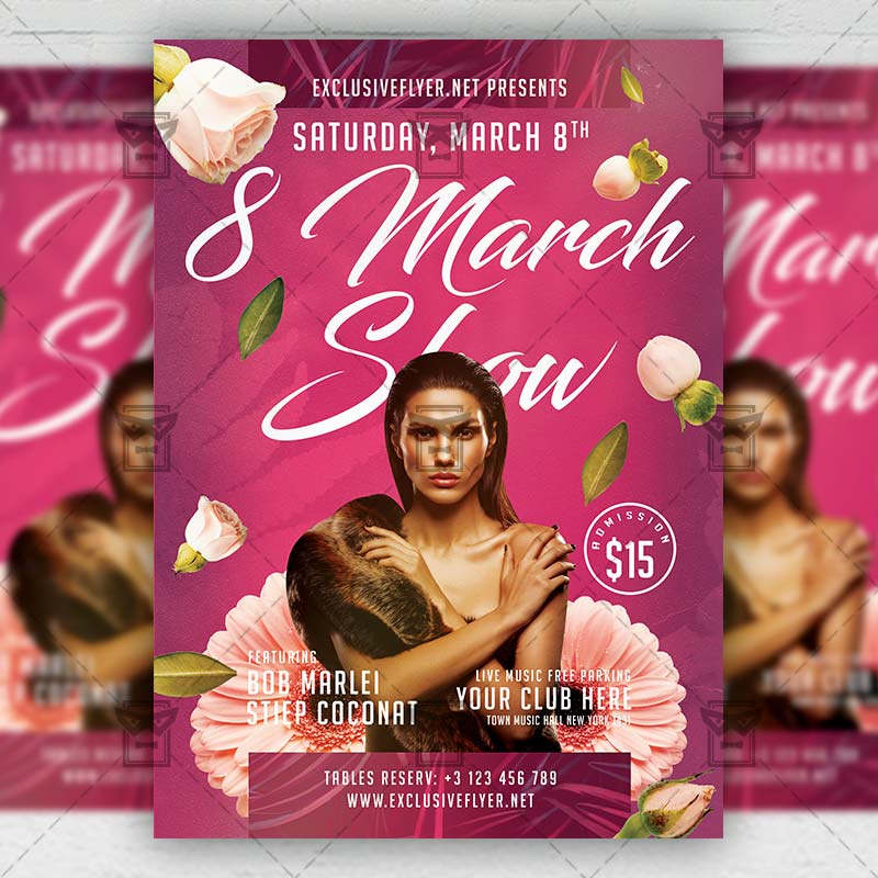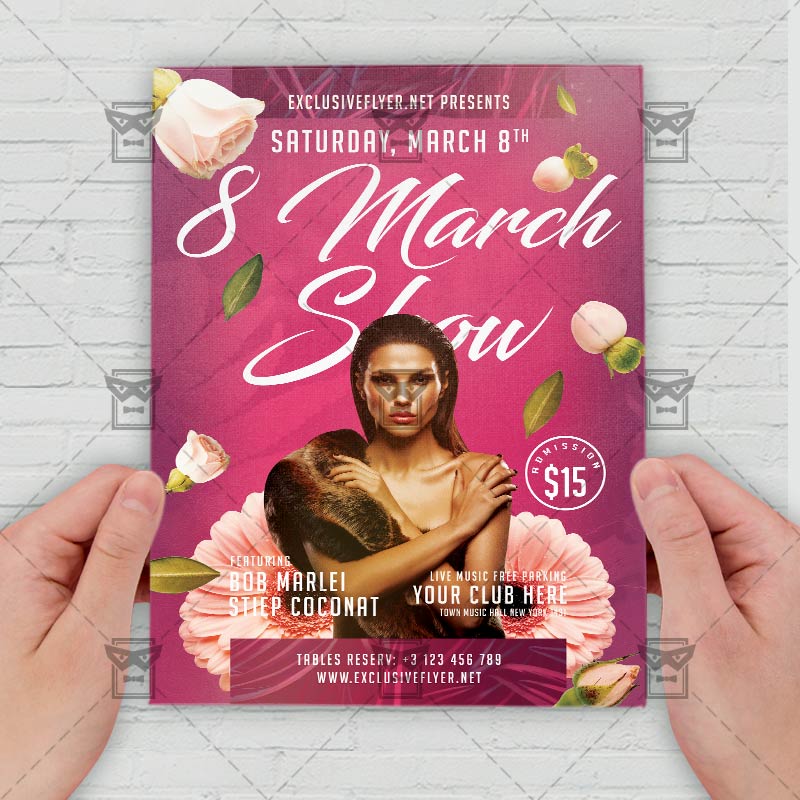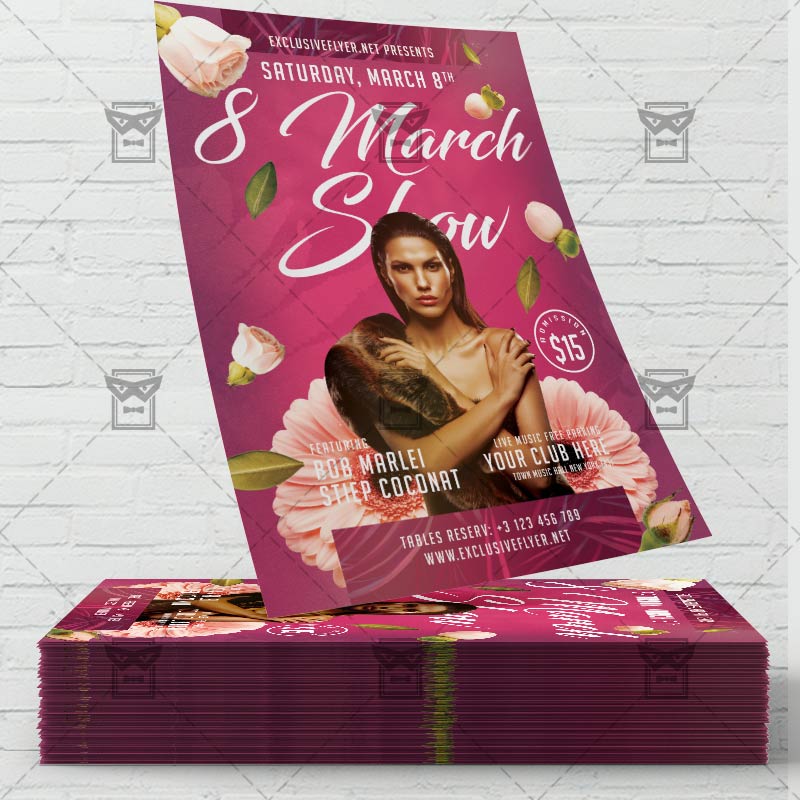 8 March Show Template an exclusive PSD flyer template for Adobe Photoshop designed by our best graphic designers to facilitate your task in promoting your business. This psd poster/flyer is the best choice for Women’s Day Party, Woman’s Day Celebration, Woman’s Day Celebration, 8 March Night or International Woman’s Day. With our readymade Game flyer in psd format you can invite you customers and guest to your event with a minimum of efforts and time.