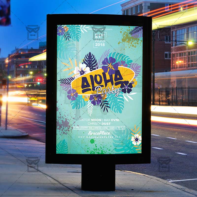 Aloha Party is an exclusive PSD flyer template for Adobe Photoshop designed by our best graphic designers to facilitate your task in promoting your business. With our readymade Summer flyer in psd format you can invite you customers and guest to your event or to the best Tiki Bar Party, Tiki Party, Hawaii Night or Aloha Party in their lives.