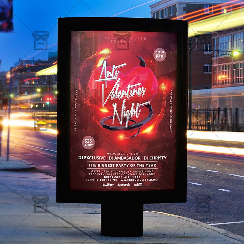 Anti Valentines Night is an exclusive PSD flyer template for Adobe Photoshop designed by our best graphic designers to facilitate your task in promoting your business. With our readymade Valentines flyer in psd format you can invite you customers and guest to your event or to the best Love Party or Valentines Party in their lives.