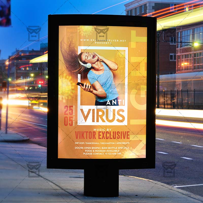 Anti Virus Night Template an exclusive PSD flyer template for Adobe Photoshop designed by our best graphic designers to facilitate your task in promoting your business. With our readymade Club flyer in psd format you can invite you customers and guest to your event or to the best Anti Virus Online Party, Online Party, Online Event, Instagram Live Party, Antivirus Party, Corona Party, Anti Virus Night or Facebook Party Online in their lives.