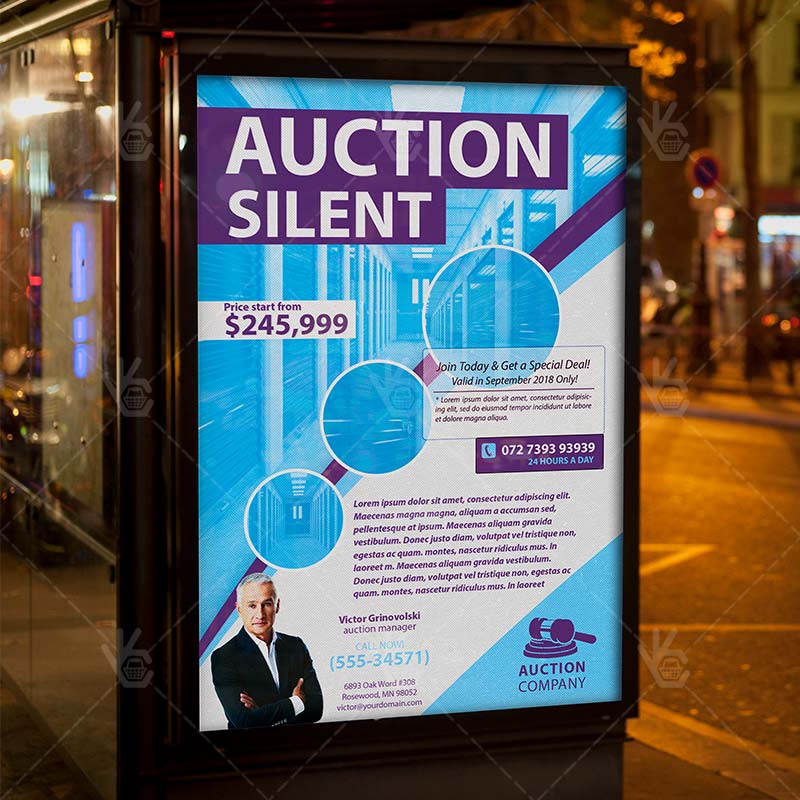 Auction Silent is a simply modern flyer design by PSDmarket Team to be used with Photoshop CS3 and higher. Save your time and use it for business or for your clients! This can be use for Charity Auction, Art Auction, Live Auction, Silent Auction, Auto Auction or Dinner Auction and others.