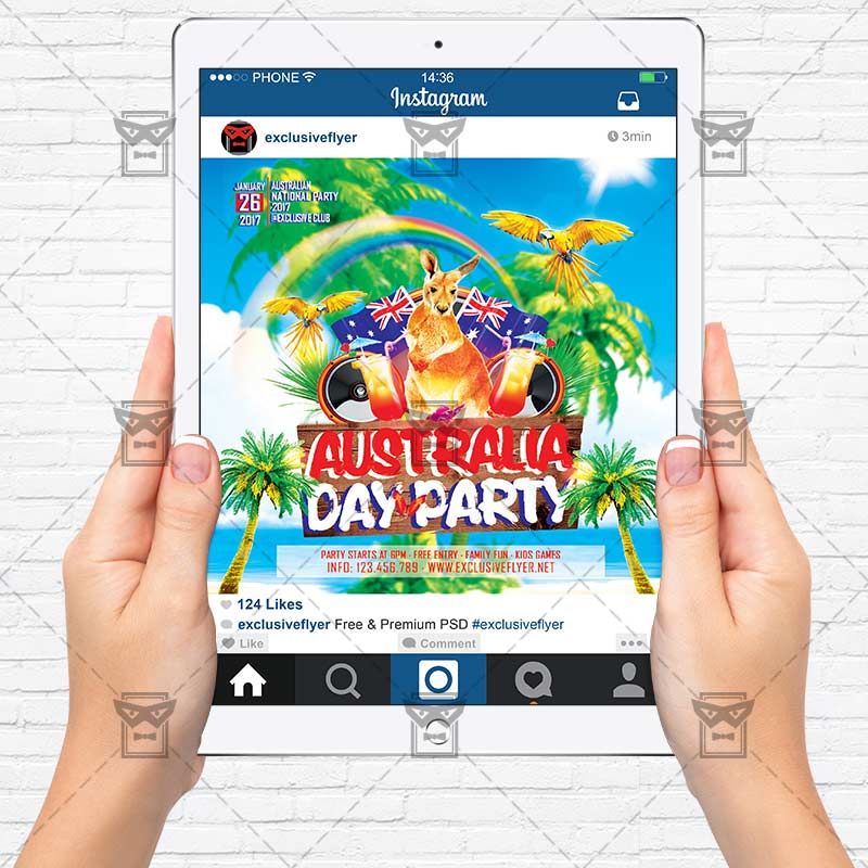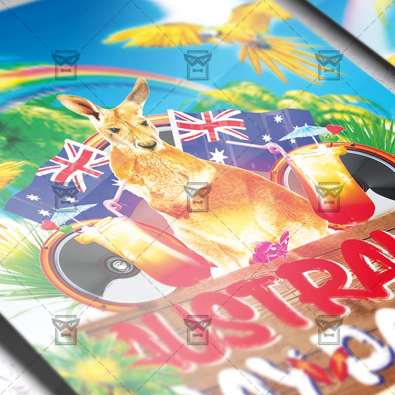 The Australia Day Party is the exclusive Photoshop PSD flyer template designed by ExclusiveFlyer to promote your Australia Day Party. This is a modern, stylish flyer and just be used for a Australia Day, Australian Day Eve etc. Dear customers! – you can also: Customize any flyers or Hire Us to create any unique product. Also, you can get unlimited access to all our templates. You can buy 1 month membership, 3 or 6 months membership or even 1 year membership plan and login on site, choose a design, click the button DOWNLOAD TEMPLATE and it’s yours. No hassle, no checkout! When you paid the template, you can find it in your personal account and of course you’ve got a message to your e-mail (maybe in spam) with link to download. Also, you can find all templates, which you buy, in your personal account! All of our flyers have a very good quality (300DPI). And it means that you just need to download one of them and make the necessary modifications such as replace the elements or choose the colors and start to invite your guests! You can order from us design of Banner Ad, Bi-Fold Brochure, Tri-Fold Brochure, Business Card, Logo, One-Sided Flyer, Two-sided Flyer or Postcard. All you need is to checkout and write us all information on our e-mail or skype. (order now). There are a lot of free flyer templates, free business card templates on our site! Also there are a lot of categories of flyers such as club flyers, seasonal flyers, sport flyers and also business flyers. You have a great choise on our site, so good luck! Don’t forget to follow our Facebook community, our page on Twitter, on Pinterest and on Tumblr and leave comments, cause we work for you! PSD is set up in 1275×1875 dimension (4” x 6” with 0,25” bleed). The PSD file is very well organised, with color coded groups and layers named appropriately. Remember, all stock images of models and other people used only for demonstration all charms of the flyer and don’t included in the download!