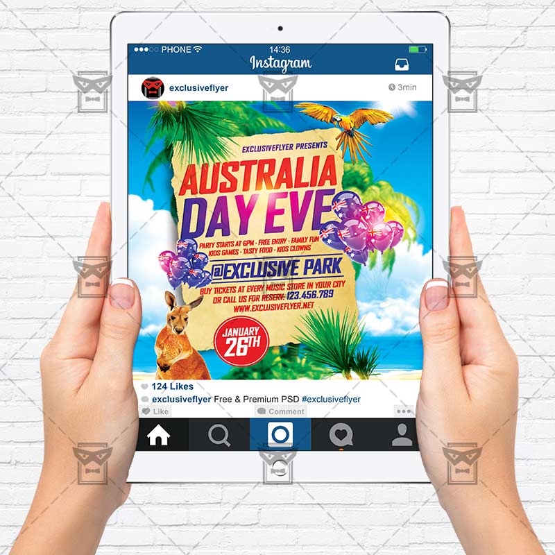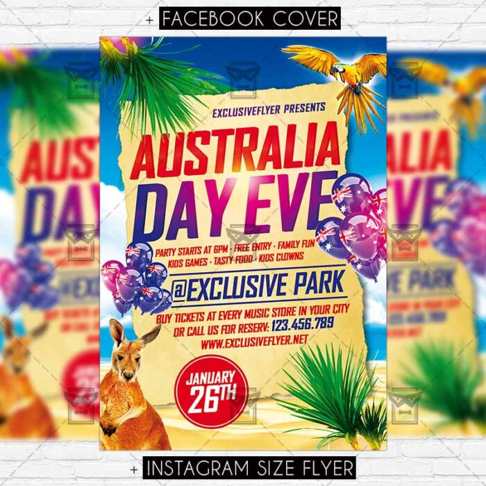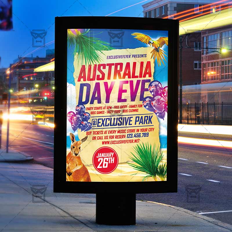 The Australia Day is the exclusive Photoshop PSD flyer template designed by ExclusiveFlyer to promote your Australia Day. This is a modern, stylish flyer and just be used for a Australia Day, Australian Day Eve etc. Dear customers! – you can also: Customize any flyers or Hire Us to create any unique product. Also, you can get unlimited access to all our templates. You can buy 1 month membership, 3 or 6 months membership or even 1 year membership plan and login on site, choose a design, click the button DOWNLOAD TEMPLATE and it’s yours. No hassle, no checkout! When you paid the template, you can find it in your personal account and of course you’ve got a message to your e-mail (maybe in spam) with link to download. Also, you can find all templates, which you buy, in your personal account! All of our flyers have a very good quality (300DPI). And it means that you just need to download one of them and make the necessary modifications such as replace the elements or choose the colors and start to invite your guests! You can order from us design of Banner Ad, Bi-Fold Brochure, Tri-Fold Brochure, Business Card, Logo, One-Sided Flyer, Two-sided Flyer or Postcard. All you need is to checkout and write us all information on our e-mail or skype. (order now). There are a lot of free flyer templates, free business card templates on our site! Also there are a lot of categories of flyers such as club flyers, seasonal flyers, sport flyers and also business flyers. You have a great choise on our site, so good luck! Don’t forget to follow our Facebook community, our page on Twitter, on Pinterest and on Tumblr and leave comments, cause we work for you! PSD is set up in 1275×1875 dimension (4” x 6” with 0,25” bleed). The PSD file is very well organised, with color coded groups and layers named appropriately. Remember, all stock images of models and other people used only for demonstration all charms of the flyer and don’t included in the download!