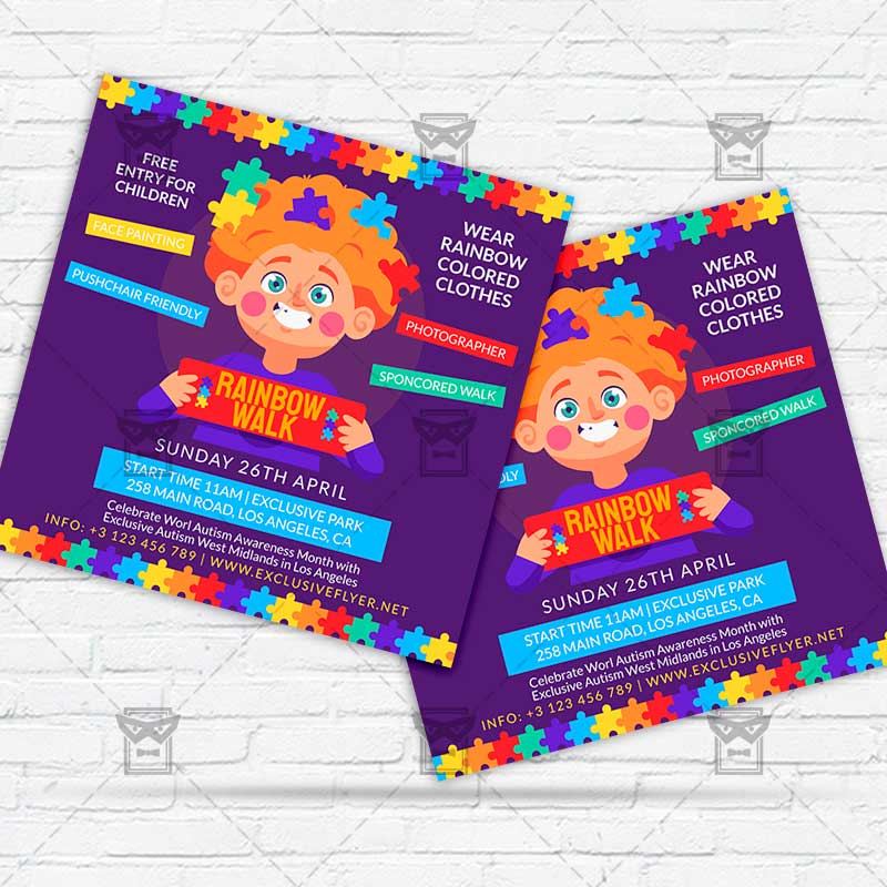 Autism Awareness Day Template an exclusive PSD flyer template for Adobe Photoshop designed by our best graphic designers to facilitate your task in promoting your business. With our readymade Club flyer in psd format you can invite you customers and guest to your event or to the best Autism Awareness Event, Autism Awareness Charity Event, Rainbow Walk Event, Autism Awareness Month, Autism Awareness Day in their lives.