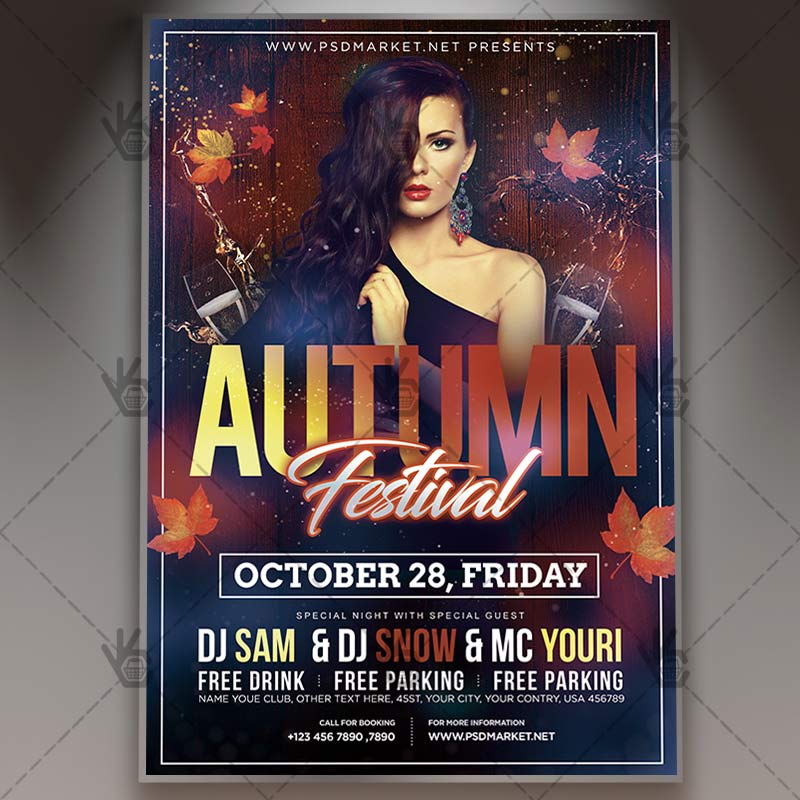 Autumn Festival Flyer is a simply modern flyer design by PSDmarket Team to be used with Photoshop CS3 and higher. Save your time and use it for business or for your clients! This can be use for Autumn Festival, Autumn Mondays, Autumn Sound, Electro Day, Electro Fest, Electro Dance Night, Club Party, Autumn Open Air Night, Autumn Party or DJ Festival and others.