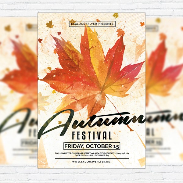 The Autumn Festival Vol.2 is the exclusive Photoshop PSD flyer template designed by ExclusiveFlyer to promote your Autumn Festival Party. This is a modern, stylish, autumn flyer and just be used for a Autumn Party or Thanksgiving Bash or Thanksgiving After Party etc. Dear customers! – you can also: Customize any flyers or Hire Us to create any unique product. Also, you can get unlimited access to all our templates. You can buy 1 month membership, 3 or 6 months membership or even 1 year membership plan and login on site, choose a design, click the button DOWNLOAD TEMPLATE and it’s yours. No hassle, no checkout! When you paid the template, you can find it in your personal account and of course you’ve got a message to your e-mail (maybe in spam) with link to download. Also, you can find all templates, which you buy, in your personal account! All of our flyers have a very good quality (300DPI). And it means that you just need to download one of them and make the necessary modifications such as replace the elements or choose the colors and start to invite your guests! You can order from us design of Banner Ad, Bi-Fold Brochure, Tri-Fold Brochure, Business Card, Logo, One-Sided Flyer, Two-sided Flyer or Postcard. All you need is to checkout and write us all information on our e-mail or skype. (order now). There are a lot of free flyer templates, free business card templates on our site! Also there are a lot of categories of flyers such as club flyers, seasonal flyers, sport flyers and also business flyers. You have a great choise on our site, so good luck! Don’t forget to follow our Facebook community, our page on Twitter, on Pinterest and on Tumblr and leave comments, cause we work for you! PSD is set up in 1275×1875 dimension (4″×6″ with 0,25″ bleed). The PSD file is very well organised, with color coded groups and layers named appropriately. Remember, all stock images of models and other people used only for demonstration all charms of the flyer and don’t included in the download!