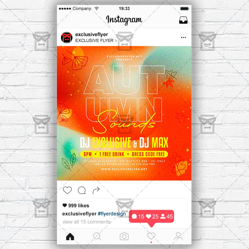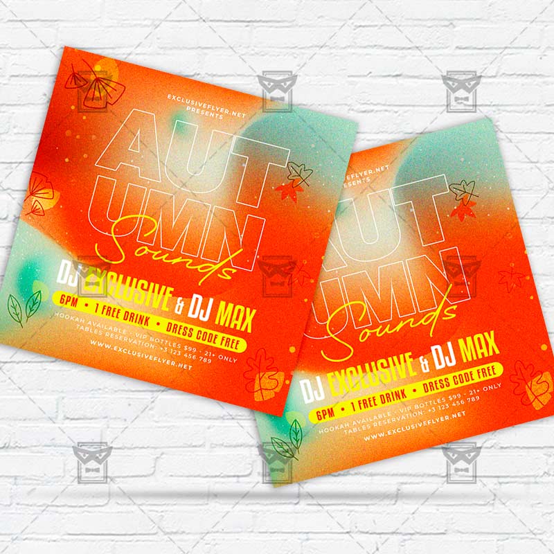 Autumn Sounds Template an exclusive PSD flyer template for Adobe Photoshop designed by our best graphic designers to facilitate your task in promoting your business. With our readymade Club flyer in psd format you can invite you customers and guest to your event or to the best Autumn Night, Autumn Chill, Autumn Vibes, Autumn Club Party, Autumn Jam, Autumn Madness Night in their lives.