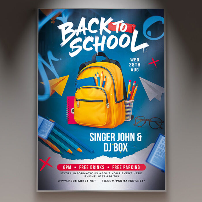 Back 2 School Flyer PSD TemplateGet ready to hit the books and the dance floor with our vibrant **Back 2 School Flyer PSD Template**! This energetic and festive design is perfect for promoting back-to-school parties, school-sponsored events, or any celebration marking the start of a new academic year. If you’re looking to create an irresistible invitation that screams “school’s back in session,” “new year, new memories,” and “the ultimate welcome party,” this flyer template is engineered to draw a massive and enthusiastic crowd of students. Expect to see striking visuals, often incorporating school-themed elements like notebooks, pencils, lockers, vibrant colors, and bold, playful typography that captures the exciting and hopeful spirit of a new school year. This template is all about setting a fun and celebratory mood, making your “Back 2 School Event” the ultimate destination for an epic gathering! The **Back 2 School Flyer PSD Template** offers a highly adaptable and professional layout, ensuring you can clearly communicate all the essential details of your event while perfectly maintaining its energetic and inviting spirit. You can easily customize the text fields to include the specific date and time of your party, the welcoming venue location (e.g., school gym, local club), any special entry requirements or ticket tiers, and information about featured DJs, live entertainment, special contests, or enticing food and drink specials, all presented in a clear and appealing way. Add an enticing description of what attendees can expect, perhaps highlighting opportunities for reuniting with old friends, making new ones, or simply dancing the night away. Detail any exciting features like a designated photo booth, a raffle for school supplies, or special discounts for students with their ID. And of course, include clear contact information or prominent social media handles for further engagement and ticket sales. Many templates also provide exciting options to incorporate additional dynamic graphics like subtle light streaks, abstract patterns, or fun, textured backgrounds, or to adjust the impactful color palette (often bright, contrasting colors against deep blues and whites) to perfectly match your brand’s aesthetic or the event’s specific school theme. This lets you create a truly unique and memorable promotional piece that looks as vibrant and exciting as your event feels. Engineered for maximum reach, the **Back 2 School Flyer PSD Template** is designed to be both print-ready for stunning physical distribution and seamlessly optimized for digital sharing. This ensures your exciting invitation reaches a wide and enthusiastic audience. Create eye-catching physical flyers to distribute at schools, universities, student centers, or popular youth hangouts. Effortlessly share the flyer digitally through various social media channels with engaging captions that highlight the night’s energy, email announcements that build anticipation, and online event listings that attract students, parents, and anyone looking to celebrate the start of the new academic year. This dual functionality helps to maximize visibility and create significant buzz around your Back 2 School Event. By utilizing this distinctive and attention-grabbing flyer template, you’re not just announcing a party; you’re creating an invitation that broadcasts pure joyous fun and promises an experience filled with great music, dancing, and unforgettable memories, making your “Back 2 School Event” the ultimate destination for an epic gathering. Grab this template today and prepare to kick off the school year in style! — Features of the Back 2 School Flyer PSD Template