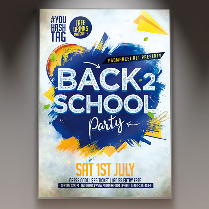 Back 2 School Party PSD TemplateGet ready to hit the books and the dance floor with our vibrant **Back 2 School Party PSD Template**! This energetic and festive design is perfect for promoting back-to-school parties, school-sponsored events, or any celebration marking the start of a new academic year. If you’re looking to create an irresistible invitation that screams “school’s back in session,” “new year, new memories,” and “the ultimate welcome party,” this flyer template is engineered to draw a massive and enthusiastic crowd of students. Expect to see striking visuals, often incorporating school-themed elements like notebooks, pencils, lockers, vibrant colors, and bold, playful typography that captures the exciting and hopeful spirit of a new school year. This template is all about setting a fun and celebratory mood, making your “Back 2 School Party” the ultimate destination for an epic gathering! The **Back 2 School Party PSD Template** offers a highly adaptable and professional layout, ensuring you can clearly communicate all the essential details of your event while perfectly maintaining its energetic and inviting spirit. You can easily customize the text fields to include the specific date and time of your party, the welcoming venue location (e.g., school gym, local club), any special entry requirements or ticket tiers, and information about featured DJs, live entertainment, special contests, or enticing food and drink specials, all presented in a clear and appealing way. Add an enticing description of what attendees can expect, perhaps highlighting opportunities for reuniting with old friends, making new ones, or simply dancing the night away. Detail any exciting features like a designated photo booth, a raffle for school supplies, or special discounts for students with their ID. And of course, include clear contact information or prominent social media handles for further engagement and ticket sales. Many templates also provide exciting options to incorporate additional dynamic graphics like subtle light streaks, abstract patterns, or fun, textured backgrounds, or to adjust the impactful color palette (often bright, contrasting colors against deep blues and whites) to perfectly match your brand’s aesthetic or the event’s specific school theme. This lets you create a truly unique and memorable promotional piece that looks as vibrant and exciting as your event feels. Engineered for maximum reach, the **Back 2 School Party PSD Template** is designed to be both print-ready for stunning physical distribution and seamlessly optimized for digital sharing. This ensures your exciting invitation reaches a wide and enthusiastic audience. Create eye-catching physical flyers to distribute at schools, universities, student centers, or popular youth hangouts. Effortlessly share the flyer digitally through various social media channels with engaging captions that highlight the night’s energy, email announcements that build anticipation, and online event listings that attract students, parents, and anyone looking to celebrate the start of the new academic year. This dual functionality helps to maximize visibility and create significant buzz around your Back 2 School Party. By utilizing this distinctive and attention-grabbing flyer template, you’re not just announcing a party; you’re creating an invitation that broadcasts pure joyous fun and promises an experience filled with great music, dancing, and unforgettable memories, making your “Back 2 School Party” the ultimate destination for an epic gathering. Grab this template today and prepare to kick off the school year in style! — Features of the Back 2 School Party PSD Template