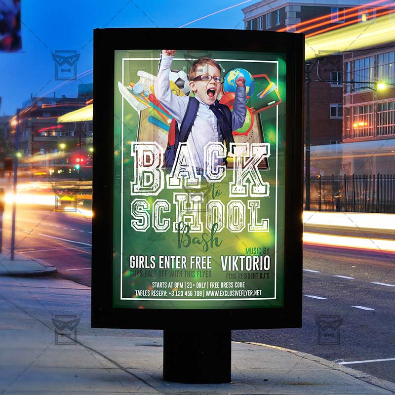 Back to School Bash an exclusive PSD flyer template for Adobe Photoshop designed by our best graphic designers to facilitate your task in promoting your business. With our readymade School flyer in psd format you can invite you customers and guest to your event or to the best Back to School Party, School Out Night, Back 2 School Night or School Party in their lives.