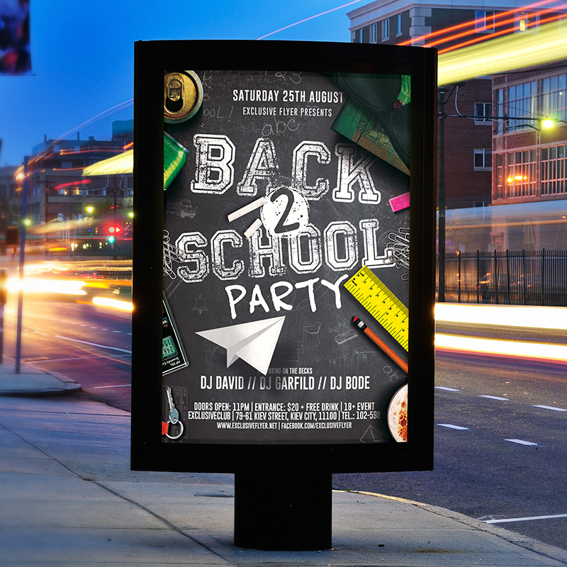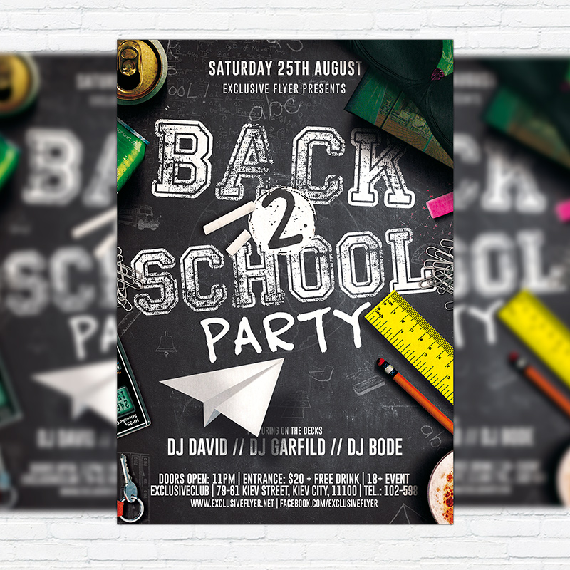 The Back to School Party is the exclusive Photoshop PSD flyer template designed by ExclusiveFlyer to promote your Back to School Party. This is a modern, stylish, school flyer and just be used for a School Night or Kids Party Night or Student Night etc. Dear customers! – you can also: Customize any flyers or Hire Us to create any unique product. Also, you can get unlimited access to all our templates. You can buy 1 month membership, 3 or 6 months membership or even 1 year membership plan and login on site, choose a design, click the button DOWNLOAD TEMPLATE and it’s yours. No hassle, no checkout! When you paid the template, you can find it in your personal account and of course you’ve got a message to your e-mail (maybe in spam) with link to download. Also, you can find all templates, which you buy, in your personal account! All of our flyers have a very good quality (300DPI). And it means that you just need to download one of them and make the necessary modifications such as replace the elements or choose the colors and start to invite your guests! You can order from us design of Banner Ad, Bi-Fold Brochure, Tri-Fold Brochure, Business Card, Logo, One-Sided Flyer, Two-sided Flyer or Postcard. All you need is to checkout and write us all information on our e-mail or skype. (order now). There are a lot of free flyer templates, free business card templates on our site! Also there are a lot of categories of flyers such as club flyers, seasonal flyers, sport flyers and also business flyers. You have a great choise on our site, so good luck! Don’t forget to follow our Facebook community, our page on Twitter, on Pinterest and on Tumblr and leave comments, cause we work for you! PSD is set up in 1275×1875 dimension (4″×6″ with 0,25″ bleed). The PSD file is very well organised, with color coded groups and layers named appropriately. Remember, all stock images of models and other people used only for demonstration all charms of the flyer and don’t included in the download!