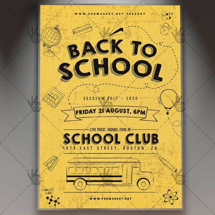 Back to School is a simply modern flyer design by PSDmarket Team to be used with Photoshop CS3 and higher. Save your time and use it for business or for your clients! This can be use for Back to School Party, Back to School Night, Back 2 School, VIP School, School Party, School Night and others.