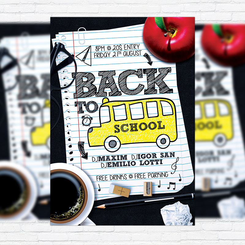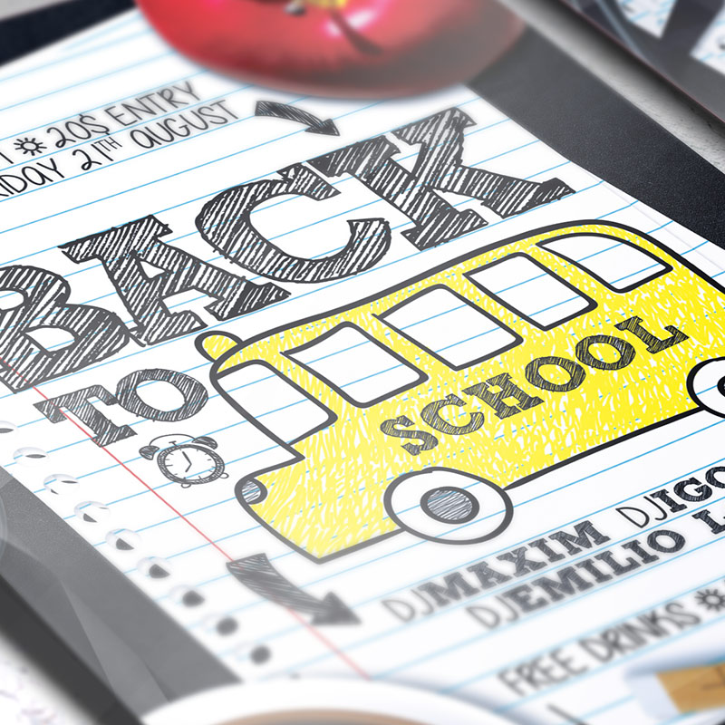 The Back To School Vol.4 is the exclusive Photoshop PSD flyer template designed by ExclusiveFlyer to promote your Back To School Party. This is a modern, stylish, school flyer and just be used for a School Night or Kids Party Night or Student Night etc. Dear customers! – you can also: Customize any flyers or Hire Us to create any unique product. Also, you can get unlimited access to all our templates. You can buy 1 month membership, 3 or 6 months membership or even 1 year membership plan and login on site, choose a design, click the button DOWNLOAD TEMPLATE and it’s yours. No hassle, no checkout! When you paid the template, you can find it in your personal account and of course you’ve got a message to your e-mail (maybe in spam) with link to download. Also, you can find all templates, which you buy, in your personal account! All of our flyers have a very good quality (300DPI). And it means that you just need to download one of them and make the necessary modifications such as replace the elements or choose the colors and start to invite your guests! You can order from us design of Banner Ad, Bi-Fold Brochure, Tri-Fold Brochure, Business Card, Logo, One-Sided Flyer, Two-sided Flyer or Postcard. All you need is to checkout and write us all information on our e-mail or skype. (order now). There are a lot of free flyer templates, free business card templates on our site! Also there are a lot of categories of flyers such as club flyers, seasonal flyers, sport flyers and also business flyers. You have a great choise on our site, so good luck! Don’t forget to follow our Facebook community, our page on Twitter, on Pinterest and on Tumblr and leave comments, cause we work for you! PSD is set up in 1275×1875 dimension (4″×6″ with 0,25″ bleed). The PSD file is very well organised, with color coded groups and layers named appropriately. Remember, all stock images of models and other people used only for demonstration all charms of the flyer and don’t included in the download!