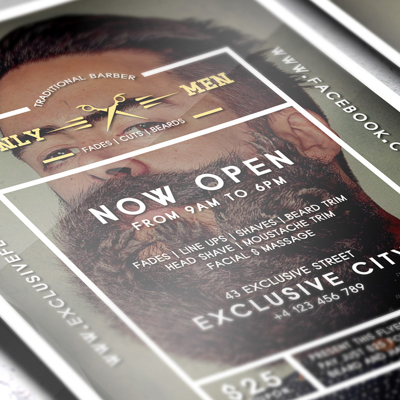 The Barber Shop is the exclusive Photoshop PSD flyer/poster template designed by ExclusiveFlyer to promote your Business. This is a modern, stylish flyer and just be used to promote your Barber Shop or Beard Party. Dear customers! – you can also: Customize any flyers or Hire Us to create any unique product. Also, you can get unlimited access to all our templates. You can buy 1 month membership, 3 or 6 months membership or even 1 year membership plan and login on site, choose a design, click the button DOWNLOAD TEMPLATE and it’s yours. No hassle, no checkout! When you paid the template, you can find it in your personal account and of course you’ve got a message to your e-mail (maybe in spam) with link to download. Also, you can find all templates, which you buy, in your personal account! All of our flyers have a very good quality (300DPI). And it means that you just need to download one of them and make the necessary modifications such as replace the elements or choose the colors and start to invite your guests! You can order from us design of Banner Ad, Bi-Fold Brochure, Tri-Fold Brochure, Business Card, Logo, One-Sided Flyer, Two-sided Flyer or Postcard. All you need is to checkout and write us all information on our e-mail or skype. (order now). There are a lot of free flyer templates, free business card templates on our site! Also there are a lot of categories of flyers such as club flyers, seasonal flyers, sport flyers and also business flyers. You have a great choise on our site, so good luck! Don’t forget to follow our Facebook community, our page on Twitter, on Pinterest and on Tumblr and leave comments, cause we work for you! PSD is set up in 1275×1875 dimension (4” x 6” with 0,25” bleed). The PSD file is very well organised, with color coded groups and layers named appropriately. Remember, all stock images of models and other people used only for demonstration all charms of the flyer and don’t included in the download!