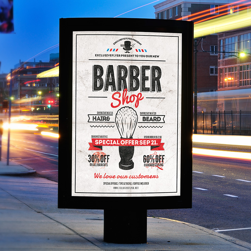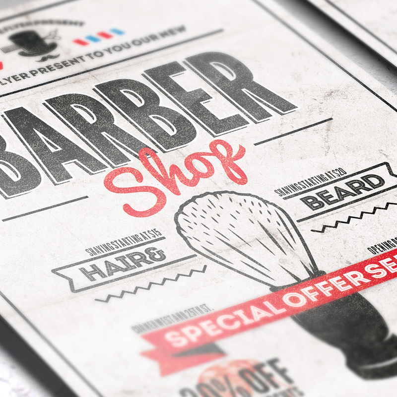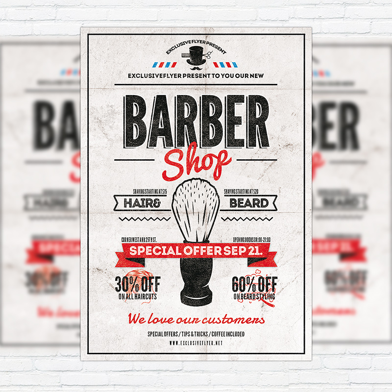 The Barber Shop Vol.2 is the exclusive Photoshop PSD flyer template designed by ExclusiveFlyer to promote your Barber Shop Party. This is a modern, stylish, white flyer and just be used for a Barbers Shop Party or Barbers Shop Night or Barbers Battle etc. Dear customers! – you can also: Customize any flyers or Hire Us to create any unique product. Also, you can get unlimited access to all our templates. You can buy 1 month membership, 3 or 6 months membership or even 1 year membership plan and login on site, choose a design, click the button DOWNLOAD TEMPLATE and it’s yours. No hassle, no checkout! When you paid the template, you can find it in your personal account and of course you’ve got a message to your e-mail (maybe in spam) with link to download. Also, you can find all templates, which you buy, in your personal account! All of our flyers have a very good quality (300DPI). And it means that you just need to download one of them and make the necessary modifications such as replace the elements or choose the colors and start to invite your guests! You can order from us design of Banner Ad, Bi-Fold Brochure, Tri-Fold Brochure, Business Card, Logo, One-Sided Flyer, Two-sided Flyer or Postcard. All you need is to checkout and write us all information on our e-mail or skype. (order now). There are a lot of free flyer templates, free business card templates on our site! Also there are a lot of categories of flyers such as club flyers, seasonal flyers, sport flyers and also business flyers. You have a great choise on our site, so good luck! Don’t forget to follow our Facebook community, our page on Twitter, on Pinterest and on Tumblr and leave comments, cause we work for you! PSD is set up in 1275×1875 dimension (4″×6″ with 0,25″ bleed). The PSD file is very well organised, with color coded groups and layers named appropriately. Remember, all stock images of models and other people used only for demonstration all charms of the flyer and don’t included in the download!