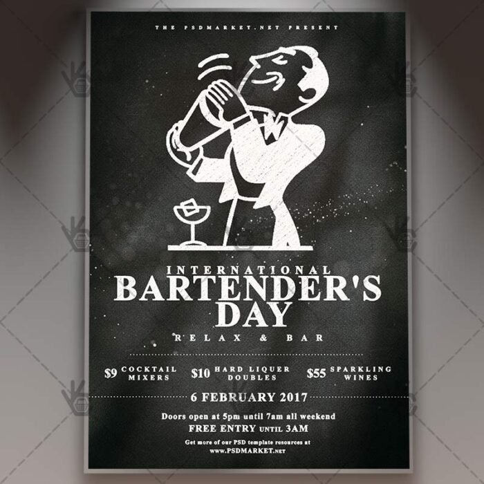 Bartenders Party is a simply modern flyer design by PSDmarket Team to be used with Photoshop CS3 and higher. Save your time and use it for business or for your clients! This can be use for Bartenders Day, Drinks Party, Weekend Night and others.