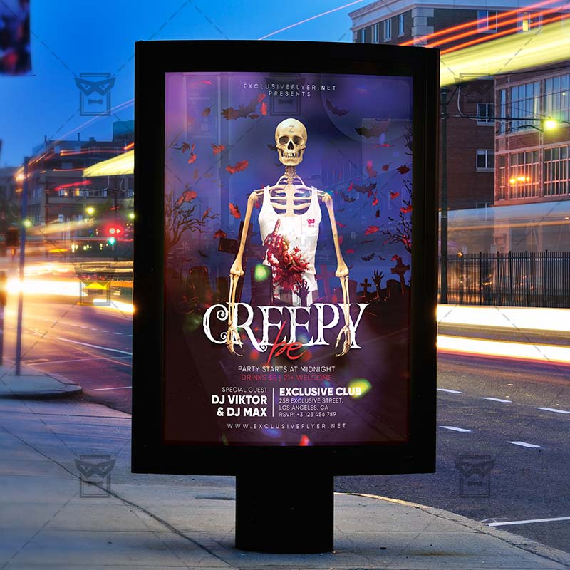 Be Creepy an exclusive PSD flyer template for Adobe Photoshop designed by our best graphic designers to facilitate your task in promoting your business. With our readymade Club flyer in psd format you can invite you customers and guest to your event or to the best Spooky Night, Halloween Night, Beautiful Nightmare, Scary Night Party or Halloween Affair in their lives.