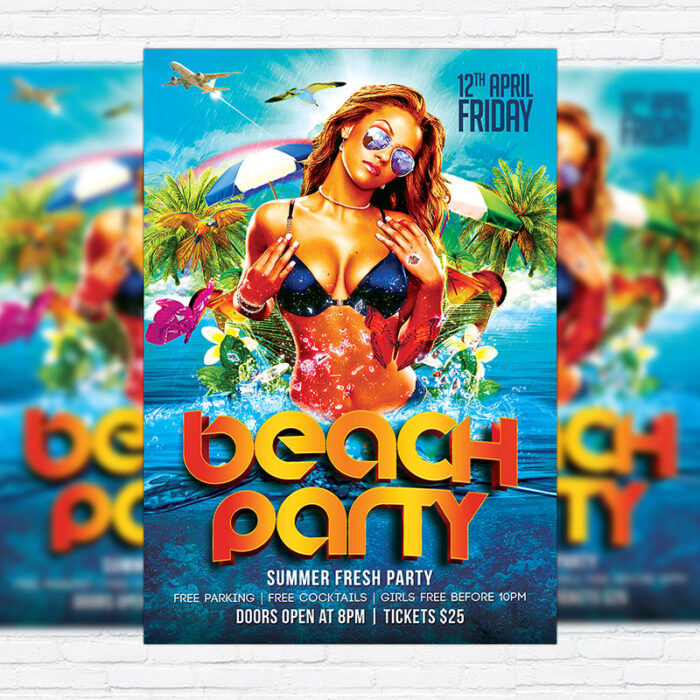 The Beach Party is the exclusive Photoshop PSD flyer template designed by ExclusiveFlyer to promote your Beach Party. This is a modern, stylish flyer and just be used for a Summer Party or Ocean Party etc. Dear customers! – you can also: Customize any flyers or Hire Us to create any unique product. Also, you can get unlimited access to all our templates. You can buy 1 month membership, 3 or 6 months membership or even 1 year membership plan and login on site, choose a design, click the button DOWNLOAD TEMPLATE and it’s yours. No hassle, no checkout! When you paid the template, you can find it in your personal account and of course you’ve got a message to your e-mail (maybe in spam) with link to download. Also, you can find all templates, which you buy, in your personal account! All of our flyers have a very good quality (300DPI). And it means that you just need to download one of them and make the necessary modifications such as replace the elements or choose the colors and start to invite your guests! You can order from us design of Banner Ad, Bi-Fold Brochure, Tri-Fold Brochure, Business Card, Logo, One-Sided Flyer, Two-sided Flyer or Postcard. All you need is to checkout and write us all information on our e-mail or skype. (order now). There are a lot of free flyer templates, free business card templates on our site! Also there are a lot of categories of flyers such as club flyers, seasonal flyers, sport flyers and also business flyers. You have a great choise on our site, so good luck! Don’t forget to follow our Facebook community, our page on Twitter, on Pinterest and on Tumblr and leave comments, cause we work for you! PSD is set up in 1275×1875 dimension (4” x 6” with 0,25” bleed). The PSD file is very well organised, with color coded groups and layers named appropriately. Remember, all stock images of models and other people used only for demonstration all charms of the flyer and don’t included in the download!