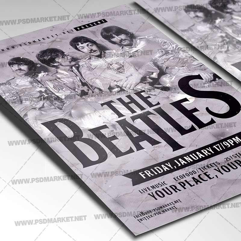 Beatles Event Flyer is a simply modern flyer design by PSDmarket Team to be used with Photoshop CS3 and higher. Save your time and use it for business or for your clients! This can be use for Beatles Event, Beatles Day Party, Beatles Night, Beatles Party, Beatles Night, The Beatles Day Celebration, Beatles Celebration, Beatles Party Night, Remember Beatles or Beatles Day and others.