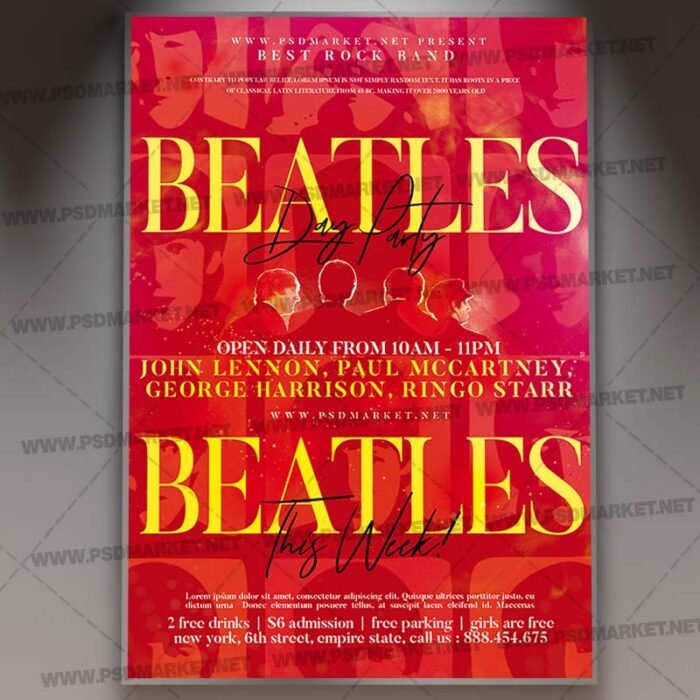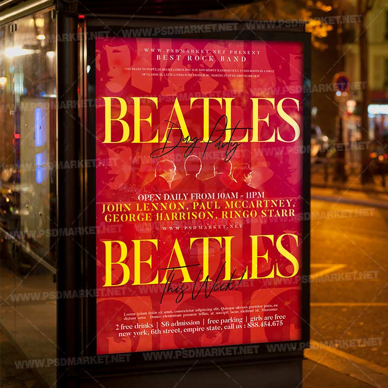 Beatles Event Party Flyer is a simply modern flyer design by PSDmarket Team to be used with Photoshop CS3 and higher. Save your time and use it for business or for your clients! This can be use for Beatles Event Party, Beatles Event, Beatles Day Party, Beatles Night, Beatles Party, Beatles Night, The Beatles Day Celebration, Beatles Celebration, Beatles Party Night, Remember Beatles or Beatles Day and others.