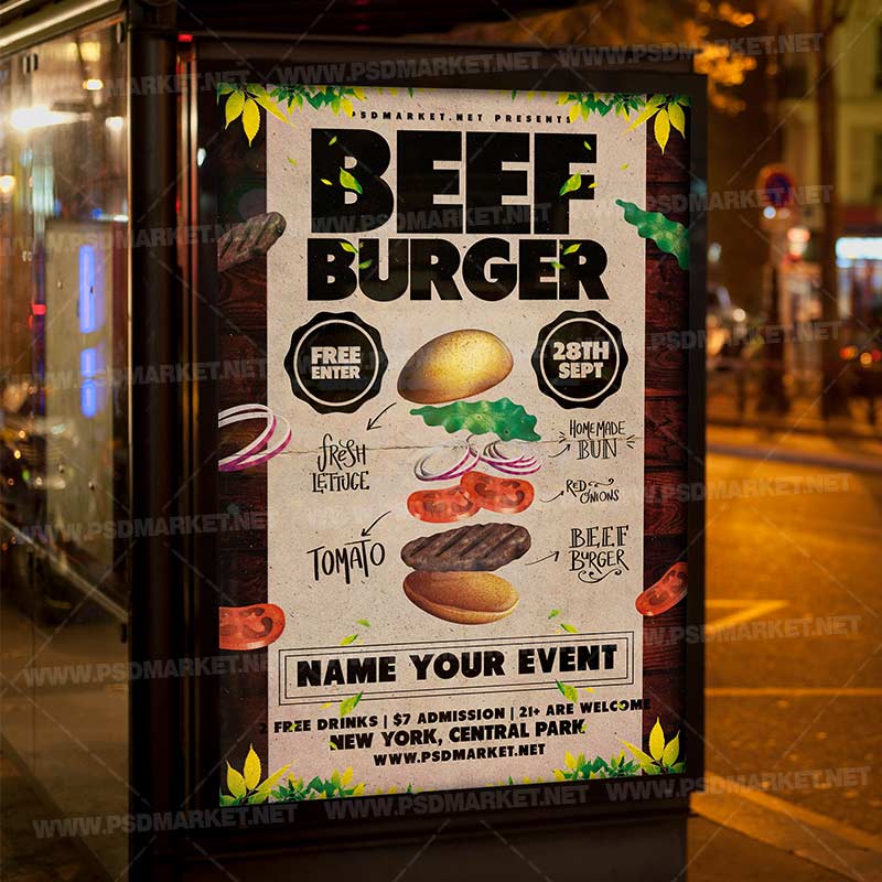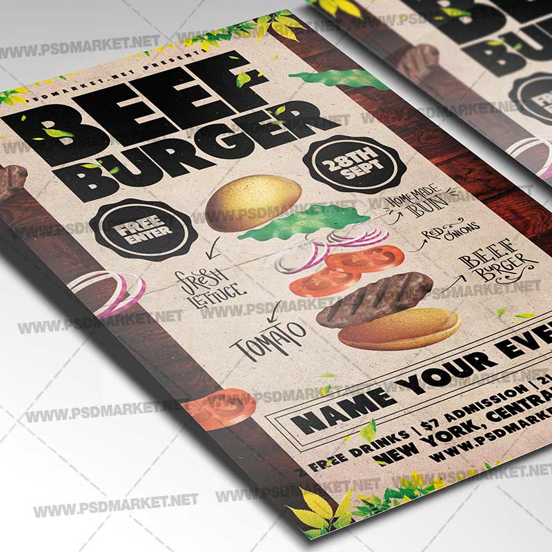 Beef Burger Template Flyer PSD is a simply modern flyer design by PSDmarket Team to be used with Photoshop CS3 and higher. Save your time and use it for business or for your clients! This can be use for Beef Burger, Burger Party, Super Burgers, Super Burger, Burger Party, Super Burger, Fast Food Show, Burger Party, Food Festival, Restaurant Menu, Food Night or Food Truck and others.