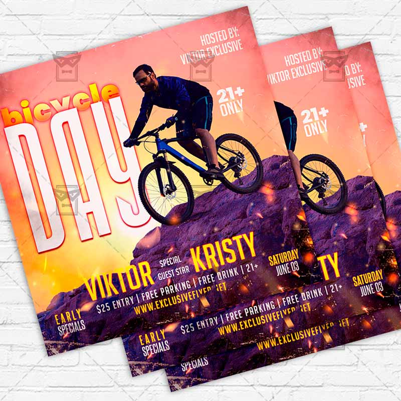 Bicycle Day Event Template an exclusive PSD flyer template for Adobe Photoshop designed by our best graphic designers to facilitate your task in promoting your business. With our readymade Club flyer in psd format you can invite you customers and guest to your event or to the best Bicycle Day Celebration, Bicycle Competition, Bicycle Marathon or Bicycle Day Event in their lives.