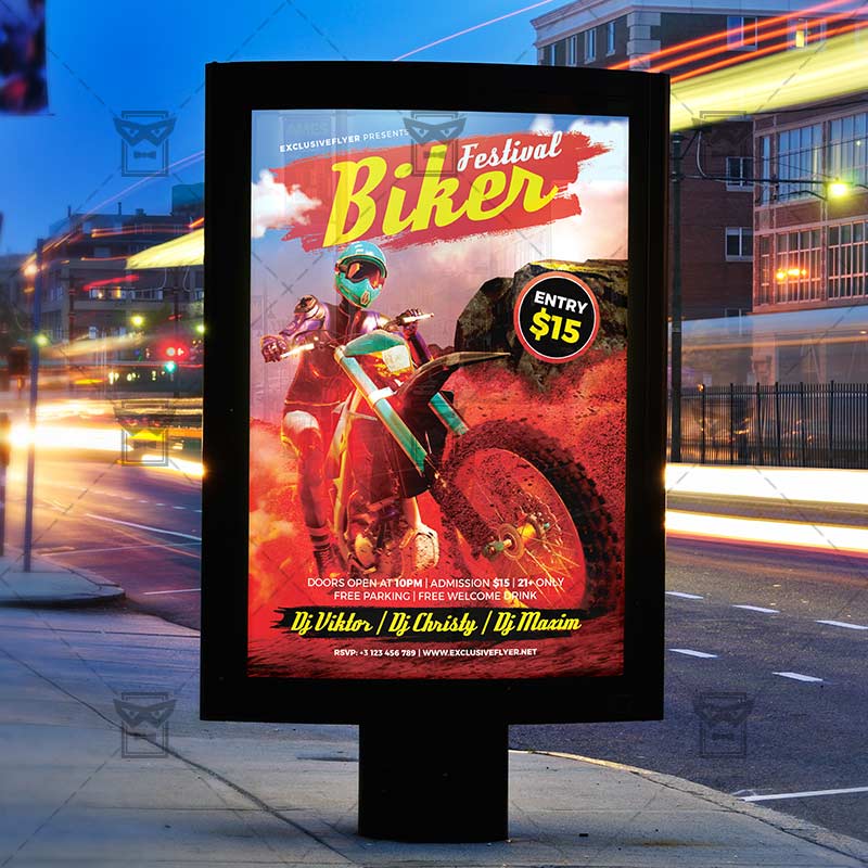 Biker Festival is an exclusive PSD flyer template for Adobe Photoshop designed by our best graphic designers to facilitate your task in promoting your business. With our readymade Biker flyer in psd format you can invite you customers and guest to your event or to the best Biker Night, Biker Festival or Motorcycling Competition in their lives.