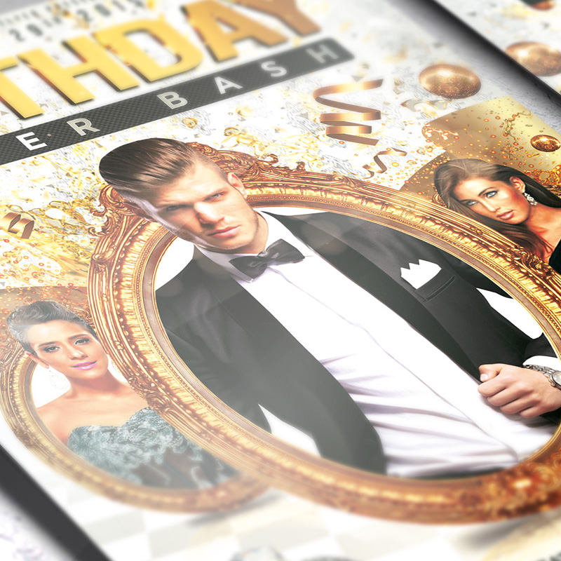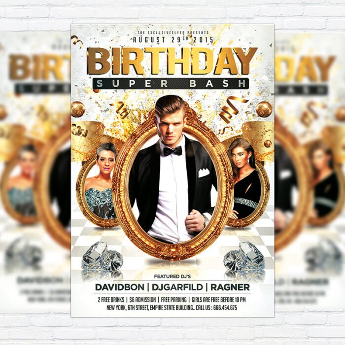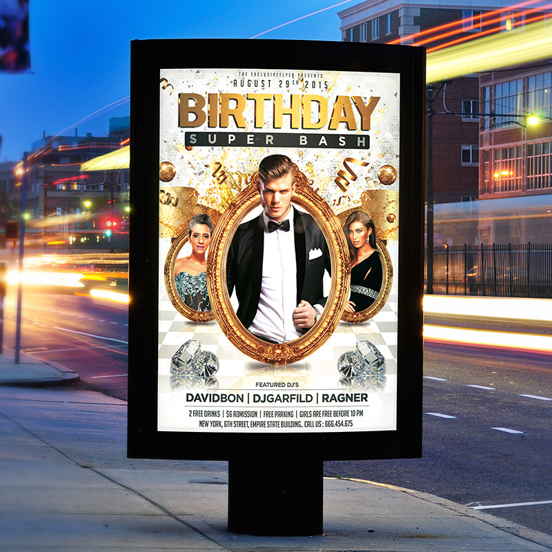 The Birthday Super Bash is the exclusive Photoshop PSD flyer template designed by ExclusiveFlyer to promote your Birthday Super Bash Flyer. This is a modern, stylish, white flyer and just be used for a Birthday Party or maybe Birthday Night. Dear customers! – you can also: Customize any flyers or Hire Us to create any unique product. Also, you can get unlimited access to all our templates. You can buy 1 month membership, 3 or 6 months membership or even 1 year membership plan and login on site, choose a design, click the button DOWNLOAD TEMPLATE and it’s yours. No hassle, no checkout! When you paid the template, you can find it in your personal account and of course you’ve got a message to your e-mail (maybe in spam) with link to download. Also, you can find all templates, which you buy, in your personal account! All of our flyers have a very good quality (300DPI). And it means that you just need to download one of them and make the necessary modifications such as replace the elements or choose the colors and start to invite your guests! You can order from us design of Banner Ad, Bi-Fold Brochure, Tri-Fold Brochure, Business Card, Logo, One-Sided Flyer, Two-sided Flyer or Postcard. All you need is to checkout and write us all information on our e-mail or skype. (order now). There are a lot of free flyer templates, free business card templates on our site! Also there are a lot of categories of flyers such as club flyers, seasonal flyers, sport flyers and also business flyers. You have a great choise on our site, so good luck! Don’t forget to follow our Facebook community, our page on Twitter, on Pinterest and on Tumblr and leave comments, cause we work for you! PSD is set up in 1275×1875 dimension (4″×6″ with 0,25″ bleed). The PSD file is very well organised, with color coded groups and layers named appropriately. Remember, all stock images of models and other people used only for demonstration all charms of the flyer and don’t included in the download!