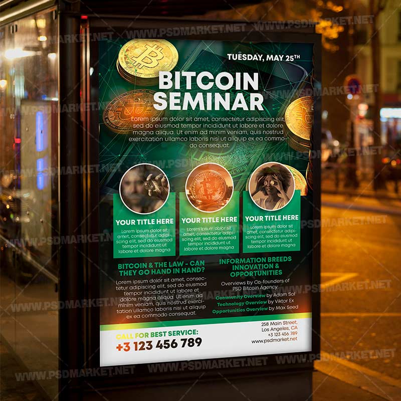Bitcoin Seminar Template Flyer PSD is a simply modern flyer design by PSDmarket Team to be used with Photoshop CS3 and higher. Save your time and use it for business or for your clients! This can be use for Cryptocurrency Workshops, Cryptocurrency Lessons, Bitcoin Seminars or Bitcoin Workshops and others.