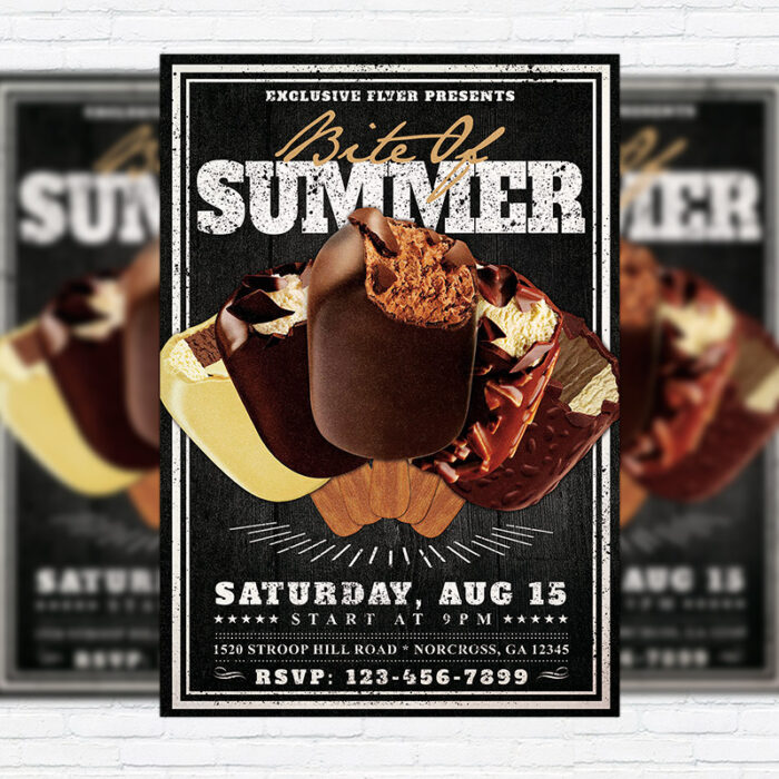 The Bite Of Summer is the exclusive Photoshop PSD flyer template designed by ExclusiveFlyer to promote your Bite Of Summer. This is a modern, stylish, black flyer and just be used for a Chilling Summer Party or Summer Night, or Ice Cream Party. Dear customers! – you can also: Customize any flyers or Hire Us to create any unique product. Also, you can get unlimited access to all our templates. You can buy 1 month membership, 3 or 6 months membership or even 1 year membership plan and login on site, choose a design, click the button DOWNLOAD TEMPLATE and it’s yours. No hassle, no checkout! When you paid the template, you can find it in your personal account and of course you’ve got a message to your e-mail (maybe in spam) with link to download. Also, you can find all templates, which you buy, in your personal account! All of our flyers have a very good quality (300DPI). And it means that you just need to download one of them and make the necessary modifications such as replace the elements or choose the colors and start to invite your guests! You can order from us design of Banner Ad, Bi-Fold Brochure, Tri-Fold Brochure, Business Card, Logo, One-Sided Flyer, Two-sided Flyer or Postcard. All you need is to checkout and write us all information on our e-mail or skype. (order now). There are a lot of free flyer templates, free business card templates on our site! Also there are a lot of categories of flyers such as club flyers, seasonal flyers, sport flyers and also business flyers. You have a great choise on our site, so good luck! Don’t forget to follow our Facebook community, our page on Twitter, on Pinterest and on Tumblr and leave comments, cause we work for you! PSD is set up in 1275×1875 dimension (4″×6″ with 0,25″ bleed). The PSD file is very well organised, with color coded groups and layers named appropriately. Remember, all stock images of models and other people used only for demonstration all charms of the flyer and don’t included in the download!