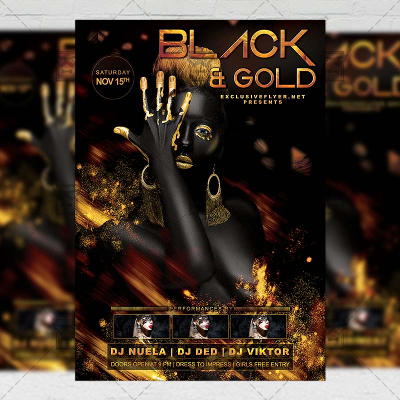 The Black and Gold Night is the exclusive Photoshop PSD flyer template designed by ExclusiveFlyer to promote your Black and Gold Night Party. This is a modern, stylish flyer and just be used for Black Night, Gold Party, Bodypaint Night etc.