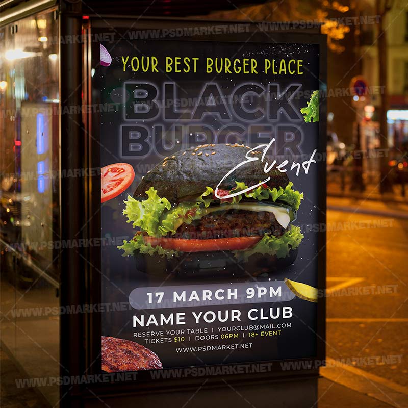 Black Burger PSD Template Flyer is a simply modern flyer design by PSDmarket Team to be used with Photoshop CS3 and higher. Save your time and use it for business or for your clients! This can be use for Black Burger, Burger Event, Burger Menu, Burger Party, Super Burger, Fast Food Show, Burger Party, Food Festival, Restaurant Menu, Food Night or Food Truck and others.