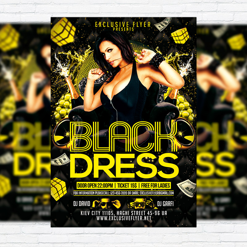 The Black Dress Party is the exclusive Photoshop PSD flyer template designed by ExclusiveFlyer to promote your Black Dress Party. This is a modern, stylish, black flyer and just be used for a VIP Party or Exclusive Night or Birthday Party etc. Dear customers! – you can also: Customize any flyers or Hire Us to create any unique product. Also, you can get unlimited access to all our templates. You can buy 1 month membership, 3 or 6 months membership or even 1 year membership plan and login on site, choose a design, click the button DOWNLOAD TEMPLATE and it’s yours. No hassle, no checkout! When you paid the template, you can find it in your personal account and of course you’ve got a message to your e-mail (maybe in spam) with link to download. Also, you can find all templates, which you buy, in your personal account! All of our flyers have a very good quality (300DPI). And it means that you just need to download one of them and make the necessary modifications such as replace the elements or choose the colors and start to invite your guests! You can order from us design of Banner Ad, Bi-Fold Brochure, Tri-Fold Brochure, Business Card, Logo, One-Sided Flyer, Two-sided Flyer or Postcard. All you need is to checkout and write us all information on our e-mail or skype. (order now). There are a lot of free flyer templates, free business card templates on our site! Also there are a lot of categories of flyers such as club flyers, seasonal flyers, sport flyers and also business flyers. You have a great choise on our site, so good luck! Don’t forget to follow our Facebook community, our page on Twitter, on Pinterest and on Tumblr and leave comments, cause we work for you! PSD is set up in 1275×1875 dimension (4″×6″ with 0,25″ bleed). The PSD file is very well organised, with color coded groups and layers named appropriately. Remember, all stock images of models and other people used only for demonstration all charms of the flyer and don’t included in the download!