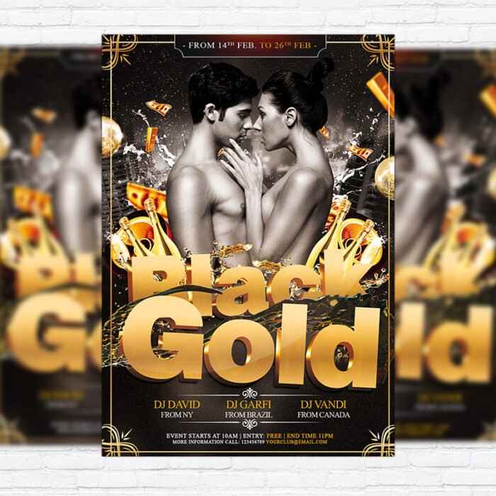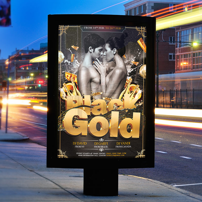 The Black Gold Party is the exclusive Photoshop PSD flyer template designed by ExclusiveFlyer to promote your Black Gold Party. This is a modern, stylish flyer and just be used for a VIP Lounge Night or VIP Party, or Lounge Night. Dear customers! – you can also: Customize any flyers or Hire Us to create any unique product. Also, you can get unlimited access to all our templates. You can buy 1 month membership, 3 or 6 months membership or even 1 year membership plan and login on site, choose a design, click the button DOWNLOAD TEMPLATE and it’s yours. No hassle, no checkout! When you paid the template, you can find it in your personal account and of course you’ve got a message to your e-mail (maybe in spam) with link to download. Also, you can find all templates, which you buy, in your personal account! All of our flyers have a very good quality (300DPI). And it means that you just need to download one of them and make the necessary modifications such as replace the elements or choose the colors and start to invite your guests! You can order from us design of Banner Ad, Bi-Fold Brochure, Tri-Fold Brochure, Business Card, Logo, One-Sided Flyer, Two-sided Flyer or Postcard. All you need is to checkout and write us all information on our e-mail or skype. (order now). There are a lot of free flyer templates, free business card templates on our site! Also there are a lot of categories of flyers such as club flyers, seasonal flyers, sport flyers and also business flyers. You have a great choise on our site, so good luck! Don’t forget to follow our Facebook community, our page on Twitter, on Pinterest and on Tumblr and leave comments, cause we work for you! PSD is set up in 1275×1875 dimension (4″×6″ with 0,25″ bleed). The PSD file is very well organised, with color coded groups and layers named appropriately. Remember, all stock images of models and other people used only for demonstration all charms of the flyer and don’t included in the download!