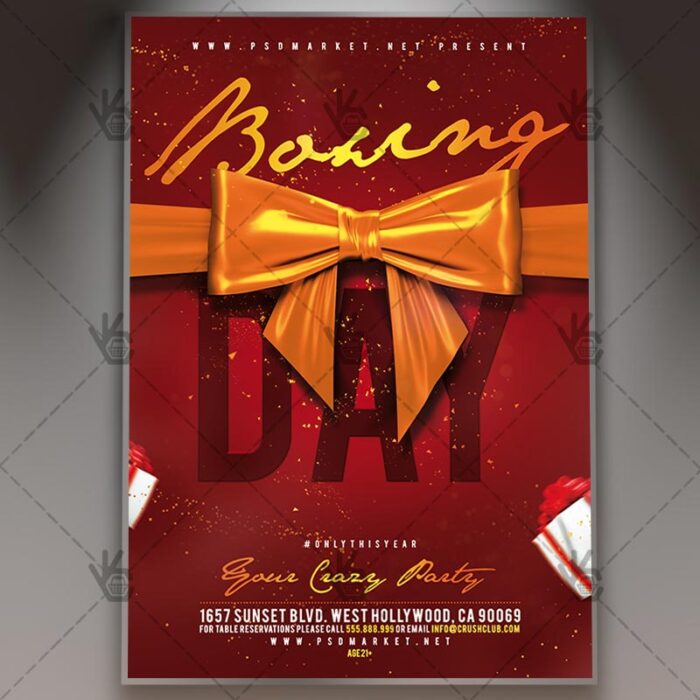 Boxing Day is a simply modern flyer design by PSDmarket Team to be used with Photoshop CS3 and higher. Save your time and use it for business or for your clients! This can be use for Boxing Day Celebration, Boxing Day Party, New Year Party, Winter Party, Christmas Party or Boxing Day Night and others.