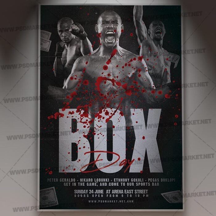 Boxing Day Template is a simply modern flyer design by PSDmarket Team to be used with Photoshop CS3 and higher. Save your time and use it for business or for your clients! This can be use for Boxing Day, Boxing Fight, Boxing Match, Boxing, Boxing Night, Boxing Game, Boxing Tournament, MMA Night, Extreme Sport, Boxing Championships, Fight Night and others.