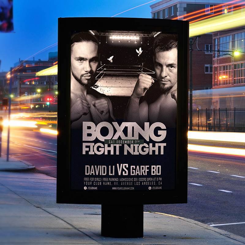 The Boxing Fight Night is the exclusive Photoshop PSD flyer template designed by ExclusiveFlyer to promote your Boxing Fight Night. This is a modern, stylish, black flyer and just be used for a Boxing Tournament or Boxing Party, or other Sport party. Dear customers! – you can also: Customize any flyers or Hire Us to create any unique product. Also, you can get unlimited access to all our templates. You can buy 1 month membership, 3 or 6 months membership or even 1 year membership plan and login on site, choose a design, click the button DOWNLOAD TEMPLATE and it’s yours. No hassle, no checkout! When you paid the template, you can find it in your personal account and of course you’ve got a message to your e-mail (maybe in spam) with link to download. Also, you can find all templates, which you buy, in your personal account! All of our flyers have a very good quality (300DPI). And it means that you just need to download one of them and make the necessary modifications such as replace the elements or choose the colors and start to invite your guests! You can order from us design of Banner Ad, Bi-Fold Brochure, Tri-Fold Brochure, Business Card, Logo, One-Sided Flyer, Two-sided Flyer or Postcard. All you need is to checkout and write us all information on our e-mail or skype. (order now). There are a lot of free flyer templates, free business card templates on our site! Also there are a lot of categories of flyers such as club flyers, seasonal flyers, sport flyers and also business flyers. You have a great choise on our site, so good luck! Don’t forget to follow our Facebook community, our page on Twitter, on Pinterest and on Tumblr and leave comments, cause we work for you! PSD is set up in 1275×1875 dimension (4″×6″ with 0,25″ bleed). The PSD file is very well organised, with color coded groups and layers named appropriately. Remember, all stock images of models and other people used only for demonstration all charms of the flyer and don’t included in the download!