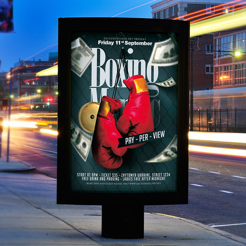 The Boxing Maniac is the exclusive Photoshop PSD flyer template designed by ExclusiveFlyer to promote your Boxing Maniac Party. This is a modern, stylish, black flyer and just be used for a Boxing Tournament or Fight Party, or other Sport party. Dear customers! – you can also: Customize any flyers or Hire Us to create any unique product. Also, you can get unlimited access to all our templates. You can buy 1 month membership, 3 or 6 months membership or even 1 year membership plan and login on site, choose a design, click the button DOWNLOAD TEMPLATE and it’s yours. No hassle, no checkout! When you paid the template, you can find it in your personal account and of course you’ve got a message to your e-mail (maybe in spam) with link to download. Also, you can find all templates, which you buy, in your personal account! All of our flyers have a very good quality (300DPI). And it means that you just need to download one of them and make the necessary modifications such as replace the elements or choose the colors and start to invite your guests! You can order from us design of Banner Ad, Bi-Fold Brochure, Tri-Fold Brochure, Business Card, Logo, One-Sided Flyer, Two-sided Flyer or Postcard. All you need is to checkout and write us all information on our e-mail or skype. (order now). There are a lot of free flyer templates, free business card templates on our site! Also there are a lot of categories of flyers such as club flyers, seasonal flyers, sport flyers and also business flyers. You have a great choise on our site, so good luck! Don’t forget to follow our Facebook community, our page on Twitter, on Pinterest and on Tumblr and leave comments, cause we work for you! PSD is set up in 1275×1875 dimension (4″×6″ with 0,25″ bleed). The PSD file is very well organised, with color coded groups and layers named appropriately. Remember, all stock images of models and other people used only for demonstration all charms of the flyer and don’t included in the download!