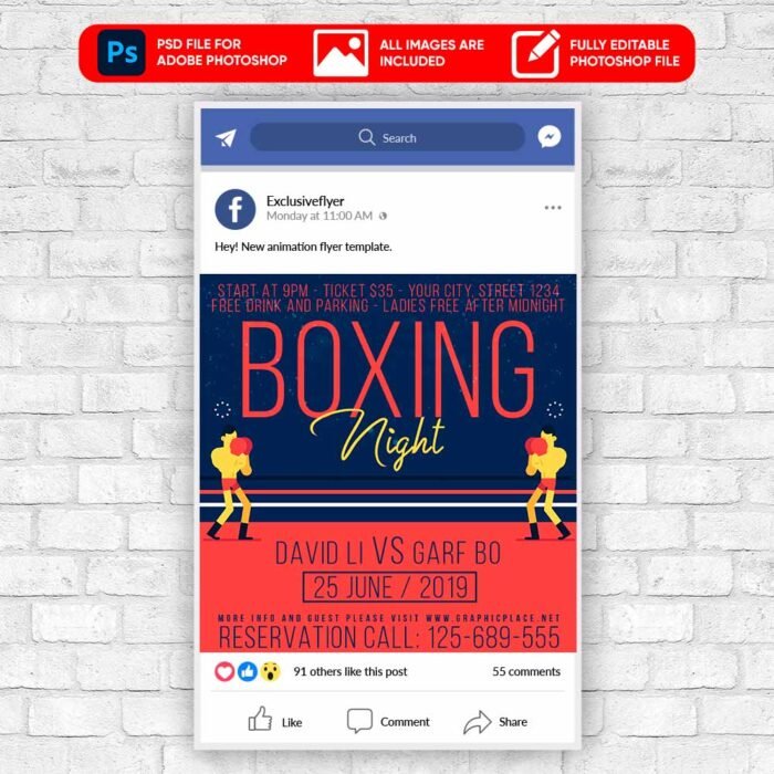 Boxing Night Social Media Video Template is great to promote your party, night club, festival, music show, karaoke bar, restaurant, sport bar, beer pub etc. You are welcome to download or buy any Video Flyer Template in PSD from Exclusiveflyer.net and become really successful! It is your exclusive chance to save your time and a lot of money, just use our ready-made PSD Video Flyers for promoting your events on Facebook with facebook covers, on Instagram or any other social network with square size videos!