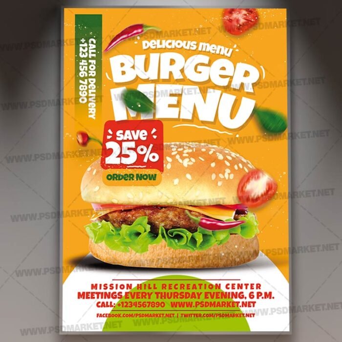 Burger Menu PSD Template Flyer is a simply modern flyer design by PSDmarket Team to be used with Photoshop CS3 and higher. Save your time and use it for business or for your clients! This can be use for Burger Menu, Burger Event, Burger Menu, Burger Party, Super Burger, Fast Food Show, Burger Party, Food Festival, Restaurant Menu, Food Night or Food Truck and others.