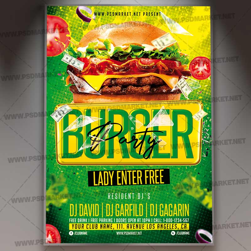 Burger Party Template Flyer PSD is a simply modern flyer design by PSDmarket Team to be used with Photoshop CS3 and higher. Save your time and use it for business or for your clients! This can be use for Burger Party, Super Burgers, Super Burger, Burger Party, Super Burger, Fast Food Show, Burger Party, Food Festival, Restaurant Menu, Food Night or Food Truck and others.