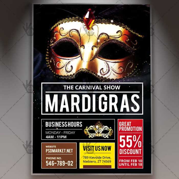 Carnival Show is a simply modern flyer design by PSDmarket Team to be used with Photoshop CS3 and higher. Save your time and use it for business or for your clients! This can be use for Mardi Gras Night, Carnival Party, Venetian Carnival Celebration and others.