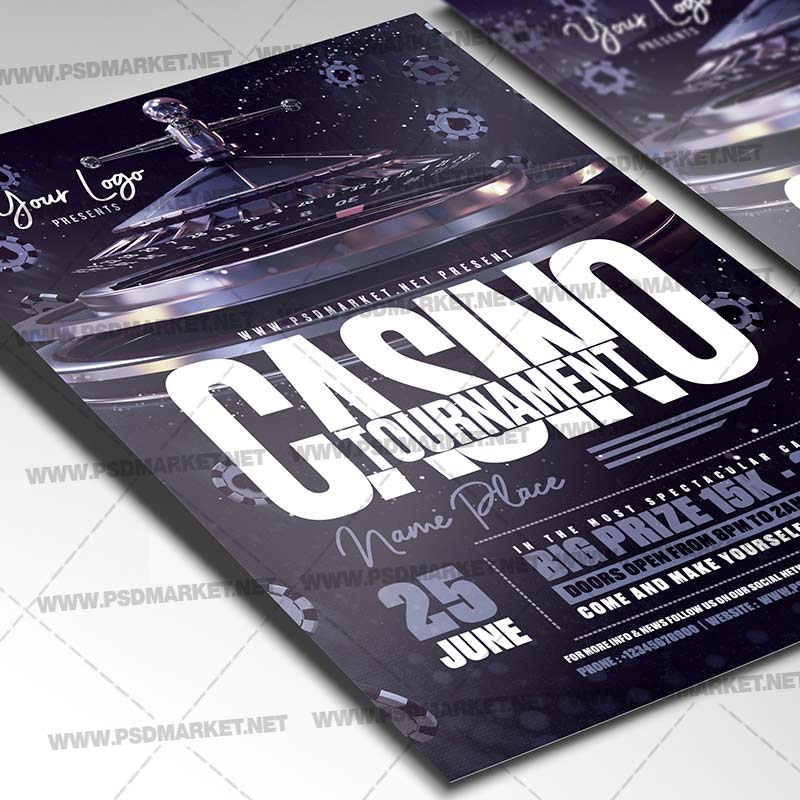 Casino Tournament Template Flyer PSD is a simply modern flyer design by PSDmarket Team to be used with Photoshop CS3 and higher. Save your time and use it for business or for your clients! This can be use for Casino, Casino Night, Poker Night, Roulette Night, Poker Tournament, Casino Royal, Las Vegas Poker Night and others.