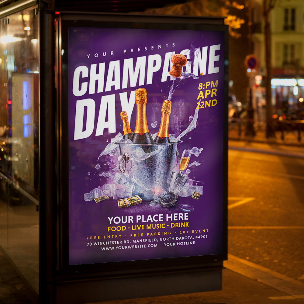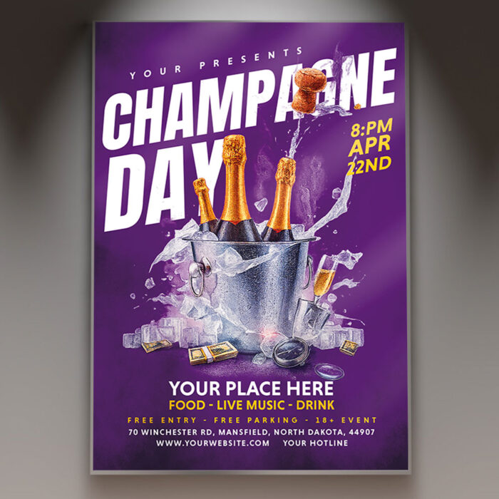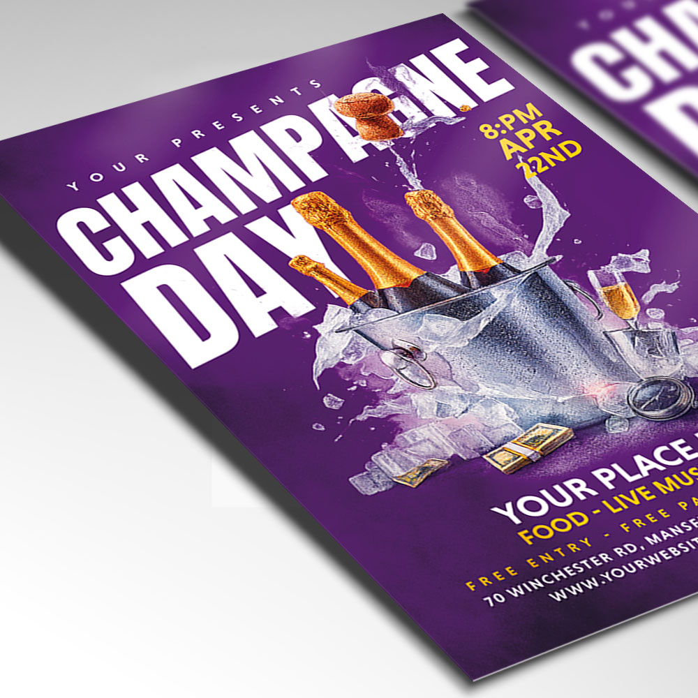 Champagne Day Flyer TemplatePop the cork and celebrate in style with our elegant **Champagne Day Flyer Template**! This sophisticated and luxurious design is perfect for promoting galas, New Year’s Eve parties, exclusive bar events, or any occasion that calls for a touch of class and bubbly. If you’re looking to create an irresistible invitation that whispers “**a night of glamour**,” “**celebrate with us**,” and “**raise a glass to the good times**,” this flyer template is engineered to draw a chic and enthusiastic crowd. Expect to see striking visuals, often incorporating classic elements like champagne flutes, effervescent bubbles, and a bold, elegant typography that captures the refined and festive spirit of a grand celebration. This template is all about setting a luxurious and sophisticated mood, making your “**Champagne Day**” event the ultimate destination for an epic gathering! The **Champagne Day Flyer Template** offers a highly adaptable and professional layout, ensuring you can clearly communicate all the essential details of your event while perfectly maintaining its glamorous and inviting spirit. You can easily customize the text fields to include the specific date and time of your event, the exquisite venue location, any special entry requirements or ticket tiers, and information about featured entertainment (e.g., a live band playing smooth jazz), special promotions (e.g., a “**two-for-one**” special on champagne), or enticing food and drink specials (e.g., “gourmet hors d’oeuvres,” “chocolate-covered strawberries”), all presented in a clear and appealing way. Add an enticing description of what attendees can expect, perhaps highlighting opportunities for a special **VIP lounge**, a themed photo booth, or simply mingling in a high-energy and inviting atmosphere. Detail any exciting features like a designated VIP area with a special drink menu, a special prize for the best-dressed guest, or a thrilling scavenger hunt. And of course, include clear contact information or prominent social media handles for further engagement and ticket sales. Many templates also provide exciting options to incorporate additional dynamic graphics like subtle light effects, energetic patterns, or flickering neon lights, or to adjust the impactful color palette (often deep blues, purples, and vibrant magentas) to perfectly match your brand’s aesthetic or the event’s specific horror theme. This lets you create a truly unique and memorable promotional piece that looks as lively and exciting as your event feels. Engineered for maximum reach, the **Champagne Day Flyer Template** is designed to be both print-ready for stunning physical distribution and seamlessly optimized for digital sharing. This ensures your exciting invitation reaches a wide and enthusiastic audience. Create eye-catching physical flyers to distribute at clubs, restaurants, liquor stores, or through local event groups. Effortlessly share the flyer digitally through various social media channels with engaging captions that highlight the night’s energetic vibe, email announcements that build anticipation, and online event listings that attract music lovers, party-goers, and anyone looking for a night of classic enjoyment. This dual functionality helps to maximize visibility and create significant buzz around your Champagne Day event. By utilizing this distinctive and attention-grabbing flyer template, you’re not just announcing a party; you’re creating an invitation that broadcasts pure authentic fun and promises an experience filled with great music, great company, and unforgettable memories, making your “**Champagne Day**” event the ultimate destination for an epic gathering. Grab this template today and get ready to dance the night away! — Features of the Champagne Day Flyer Template
